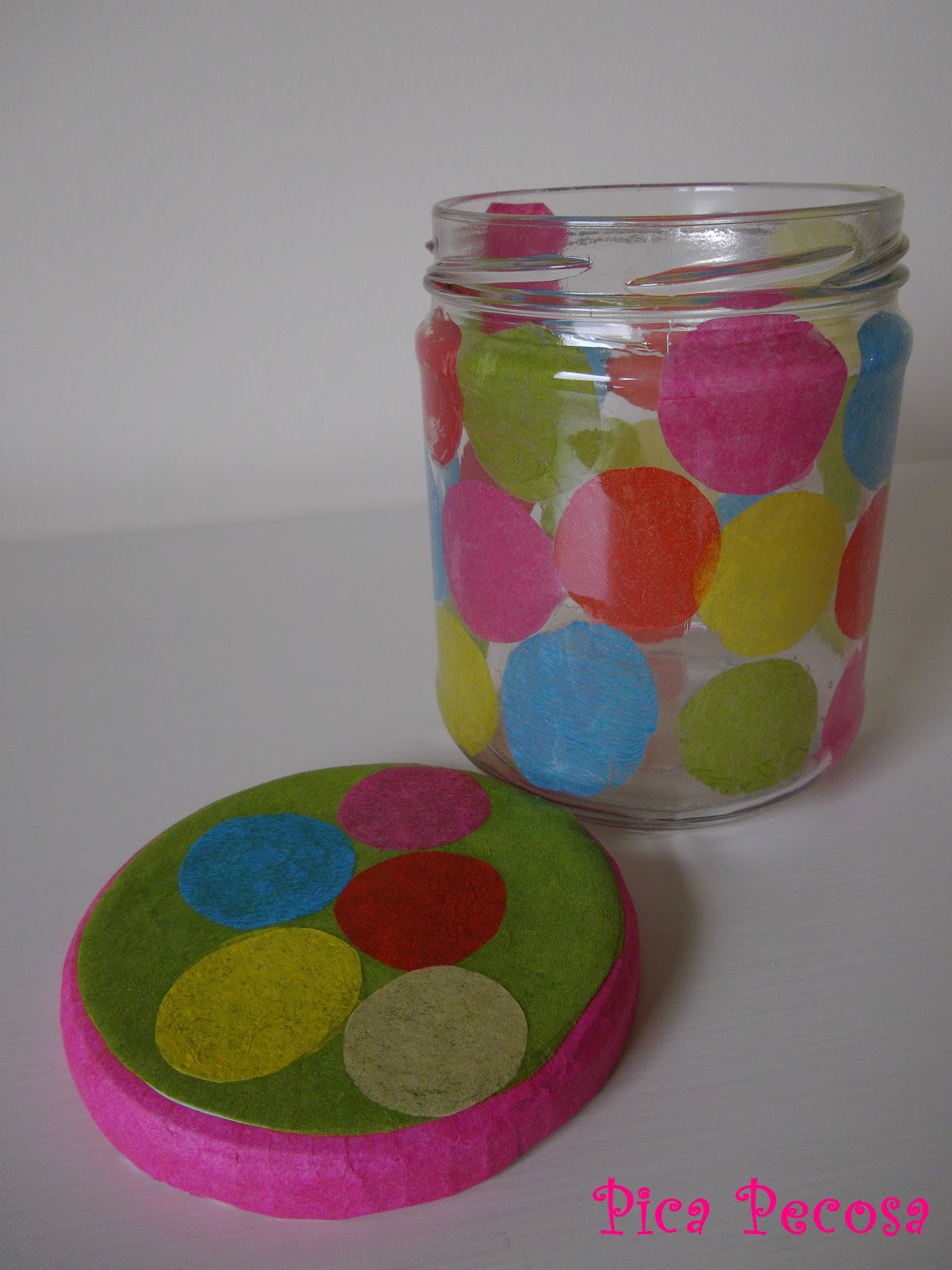 Hola a todos. Ahí afuera está lloviendo y hace frío. Para animarme, le he hecho a mi hija un bote donde guardar sus diminutos tesoros. He utilizado un bote de conservas de cristal al que he pegado topos multicolores de papel de seda.